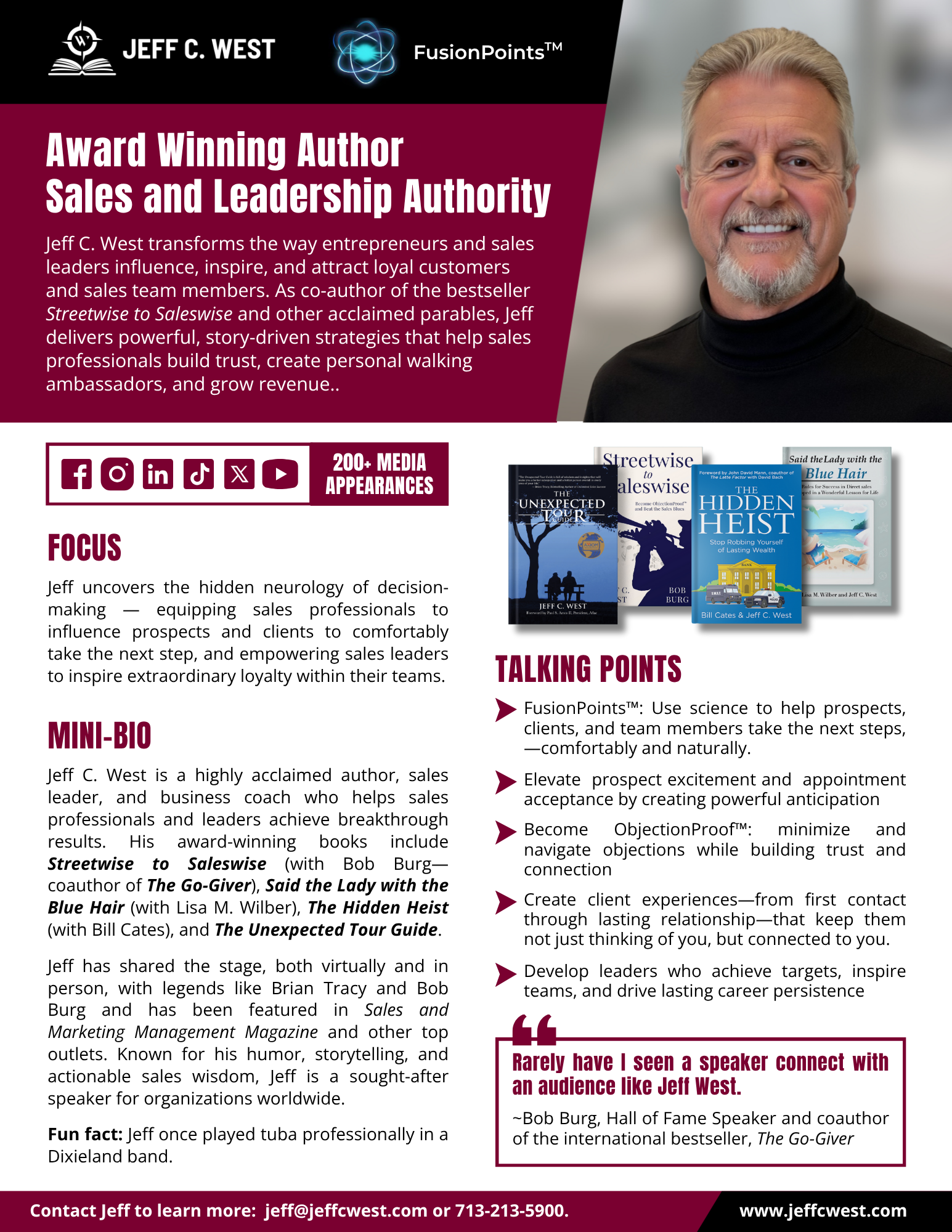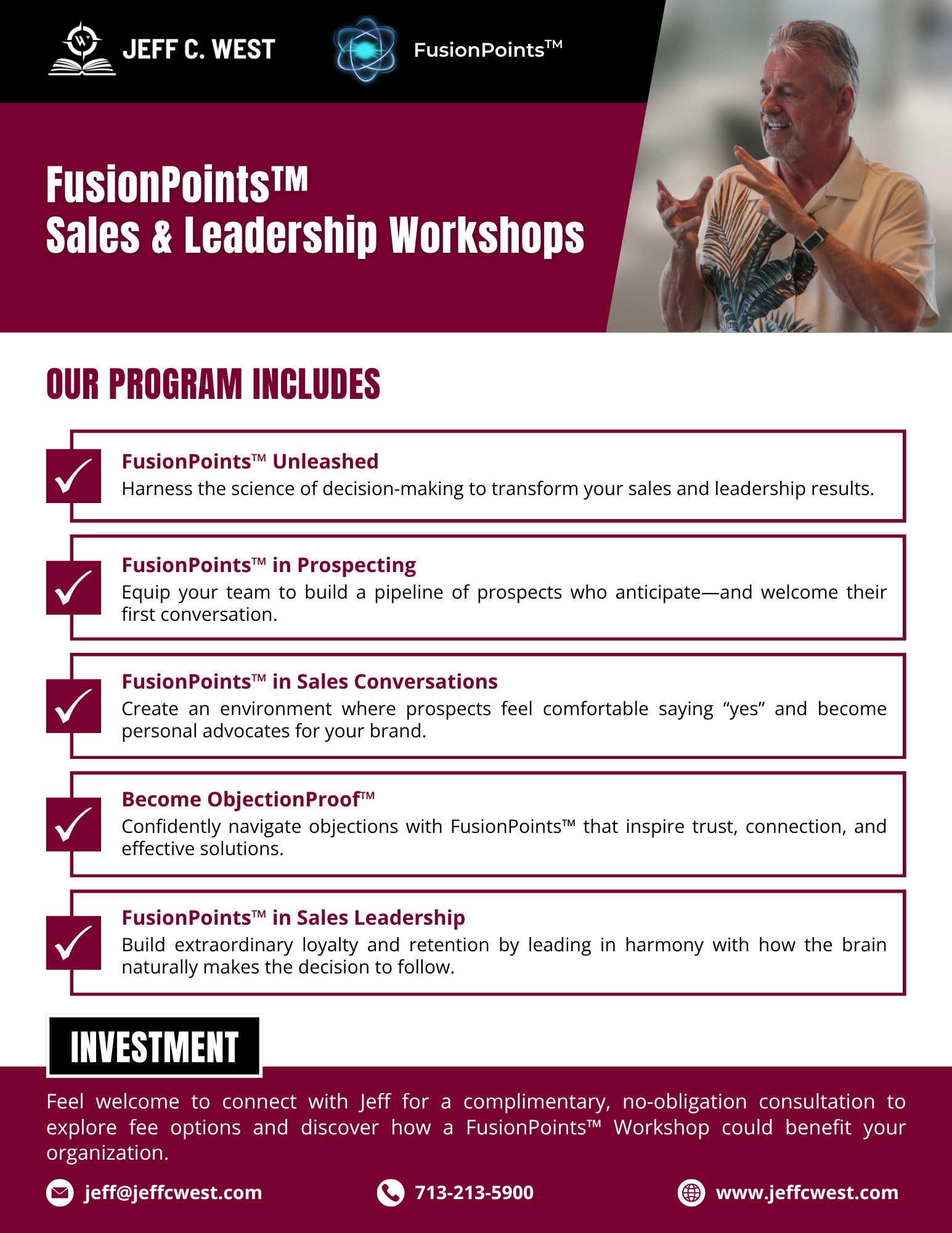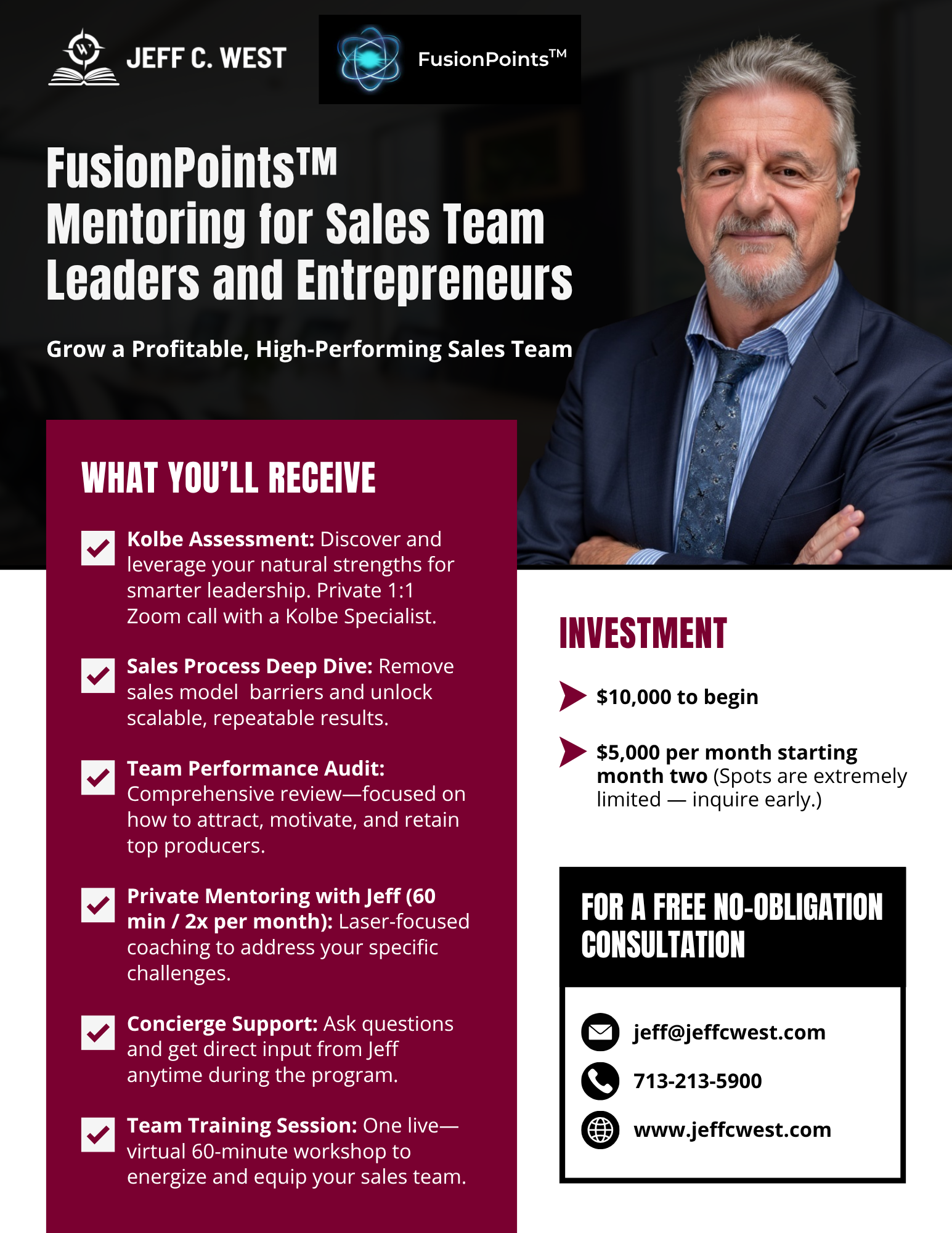 “Rarely have I seen a speaker connect with an audience like Jeff West. With over thirty years of experience—first as a top-producing salesperson and then as a legendary sales leader—Jeff blends real-world wisdom with a down-home, country-style humor that grabs attention and keeps audiences fully engaged. He teaches in a way that instills both the knowledge and the confidence to take action immediately—and get results. His FusionPoints™ methodology? That’s the game-changer today’s companies have been waiting for. Once they implement it, their increases in sales, client retention, and team loyalty, can have a massive impact on bottom line profits. For a long time now, I’ve referred to Jeff as my ‘Go-To Sales Authority’—and I’ve lost count of the number of people and companies I’ve recommended him to.”